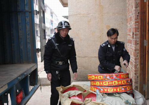 执法部门正在清点非法储运烟花爆竹