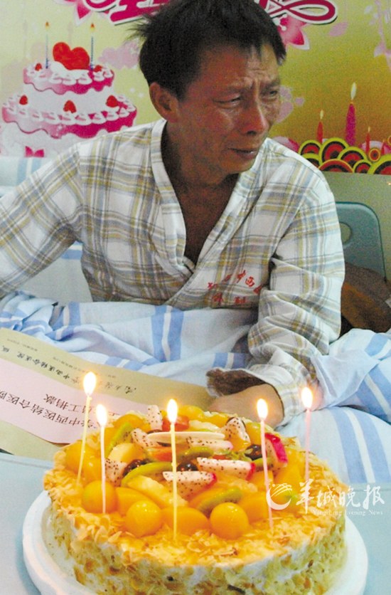 “虽然我现在不知道自己还能活多久,但在我病重的时候,有这么多人来关心我,我依然觉得自己是个幸运的人、是个幸福的病人。真的……”说这话的,是在南方医科大学中西结合医院病房里刚刚度过50岁生日的梁锦强。他脸上挂满笑意,却不停地擦眼泪。