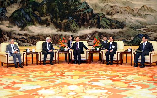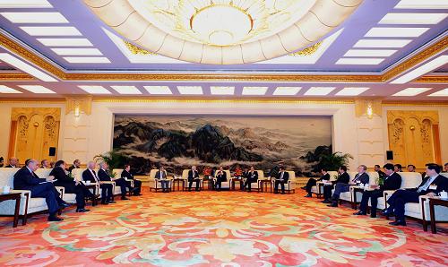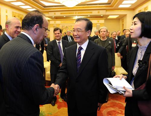 3月21日,中国国务院总理温家宝在北京人民大会堂会见出席“中国发展高层论坛2011年会”的70名境外代表。新华社记者 张铎 摄