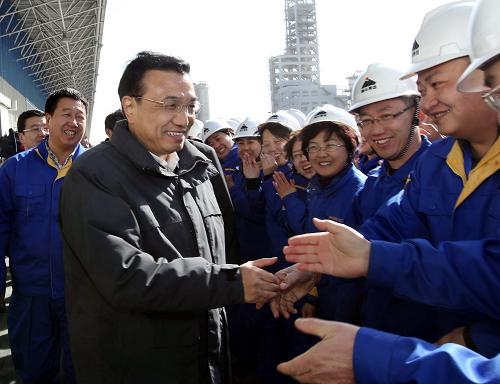 3月21日至22日,中共中央政治局常委、国务院副总理李克强在内蒙古自治区考察。这是3月21日,李克强考察神华集团包头煤化工分公司时,与职工亲切握手交谈。新华社记者刘卫兵摄