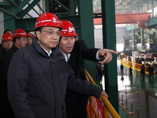 3月21日至22日,中共中央政治局常委、国务院副总理李克强在内蒙古自治区考察。这是3月21日,李克强在自动化操纵的北方重工大型无缝钢管垂直挤压生产线旁仔细观看。新华社记者刘卫兵摄