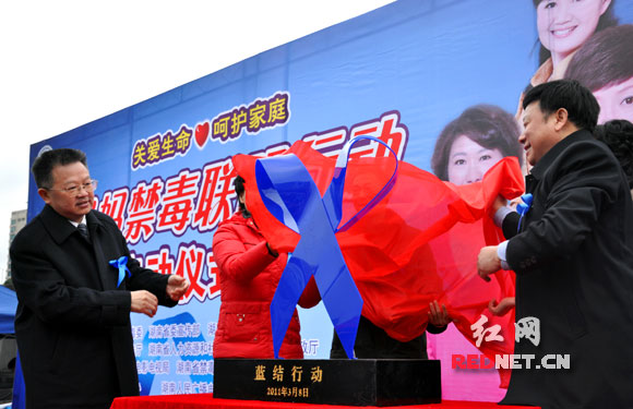 (湖南省禁毒委主任、副省长刘力伟(左一)等领导为“蓝结”标识揭幕。)