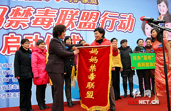 (湖南省禁毒委副主任、省政府副秘书长谈敬纯为“雨花区妈妈禁毒联盟”授旗。)
