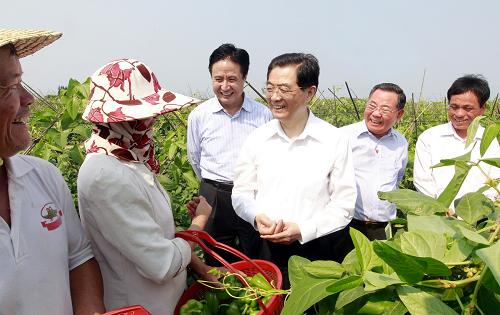 洪灾发生时,万亩良田变成了一片汪洋。当地政府组织群众及时排涝清淤、抢耕抢种,如今这里一畦畦蔬菜长势喜人。总书记行走在田垄上,望着即将丰收的菜地,脸上露出欣慰的笑容。五一村村民刘江丽一家正在套种着青椒、豇豆的菜地里摘青椒,胡锦涛同他们一起采摘,并关切询问她家去年洪灾损失大不大、现在种菜收益怎么样。刘江丽告诉总书记,虽然去年洪灾使田里庄稼全部绝收,但在当地政府帮助下,她家抢种了9亩青椒、豇豆,全家收入今年有望比去年增加。