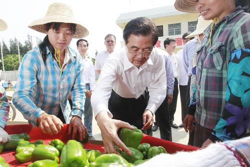 五一村的蔬菜收购点上,几名质检人员在对村民交售的蔬菜进行农药残留检测。胡锦涛向他们详细了解检测流程、标准和结果,叮嘱他们一定要把好质量安全关,让广大消费者吃上放心菜,使海南蔬菜品牌保持良好声誉,更好地开拓市场。见一些村民正在将检测合格的青椒装箱,总书记走过去,一边帮助大家装箱,一边问起蔬菜收购运输和市场销售情况。胡锦涛对村民们说,面对去年那场洪灾,你们积极开展生产自救,努力减少灾害损失。这种天灾面前不低头的精神十分可贵。总书记希望大家依靠科技、依靠政策,大力发展水果蔬菜生产,不断增加收入。