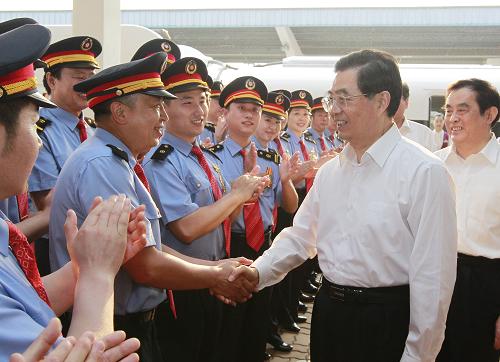 这是4月15日,胡锦涛在海口火车站亲切接见铁路系统劳动模范代表。新华社记者鞠鹏摄