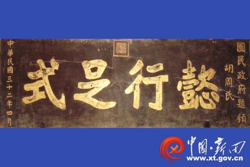 新田网讯 (通讯员史世冬 李明云) 最近,在我县惊现一方尘封60余年、缀有“荣典之玺”印章的木制匾额。该匾额由一整块长为2.4米、宽约0.78米的金丝楠木制作而成,右刻“国民政府题颁”和“胡周氏”,左刻“中华民国三十二年四月”,匾中是“懿行足式”4个镏金楷书大字,中上方为一枚13.6厘米见方的“荣典之玺”印章。经初步考证,此匾额为蒋介石亲笔题书。