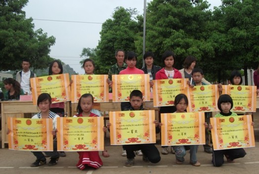 图为:金盆圩中心校领导给获奖班级颁奖现场