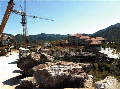 罗汉石村西侧附近山上,确实存在大量的别墅建筑,大部分已经兴建完毕。沿着一段破损严重的公路向里走,已经算是施工禁区,保安亦禁止陌生人员随意进入。随后,记者沿着周边一处缺口进入后看到,在湖边仍有别墅在兴建,而且沿着湖边一直延伸到远处山间,地面上已经铺设了大量草坪,上面有高尔夫球场设施。工地上,停着多辆挖掘机械,但并未施工。一名工人告诉记者,停工两周左右了,什么时候开工尚未通知。