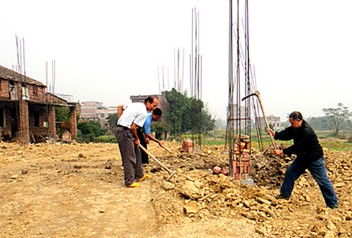 图为欧光宙在兴建的村活动室边带领村民做义务工