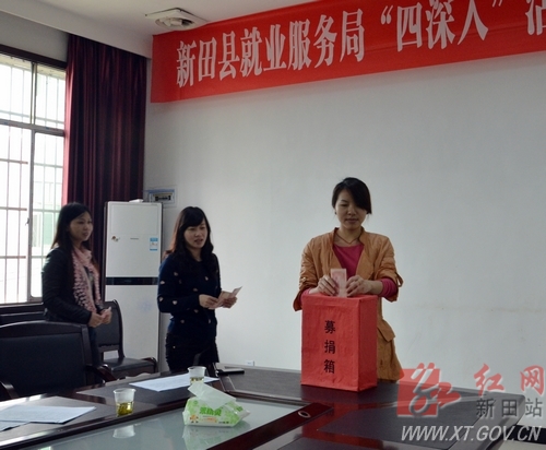 中国新田网(记者 贺华建) 4月14日,新田就业服务局组织干部职工为“四深入”活动联系村龙泉镇龙脉塘村困难群众募捐,现场共募集爱心资金共计2900元,并将爱心款送到他们的手里,表达了该局为结对困难户送去了一份真情,一份信心。