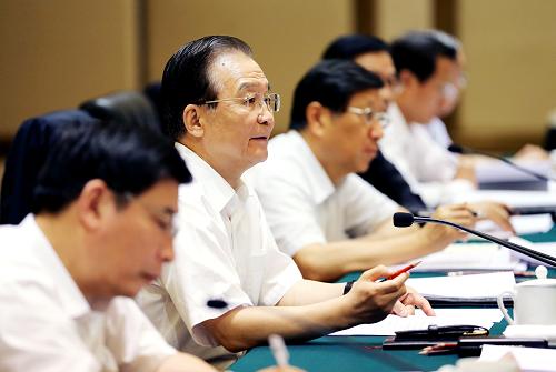 5月18日至20日,中共中央政治局常委、国务院总理温家宝在武汉市就经济运行情况进行调研并主持召开河北、辽宁、江苏、湖北、广东、陕西六省经济形势座谈会。这是5月19日下午,温家宝主持召开座谈会,与河北、辽宁、江苏、湖北、广东、陕西六省负责人一起分析研究当前形势。新华社记者 姚大伟 摄