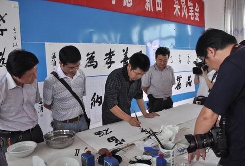 下午,陈文一行与新田部分书画爱好者在县委党校开展了艺术交流。书画家们在宣纸上挥毫泼墨,各显其能,当场书写绘就了风格各异的书画作品80余幅。作品均以“孝德”为主题,此后将刻于孝文化公园原石上,成为公园一大文化景观。