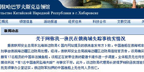 中国驻俄罗斯哈巴罗夫斯克总领馆网站17日刊登《关于网称我一渔民在俄海域失踪事核实情况》。这份情况说明称,在俄罗斯扣押中国渔船的过程中,某些媒体所说“有1名中国渔民坠海失踪”与事实不符。