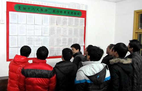 图为教师们正在看学习十八大心得体会专栏