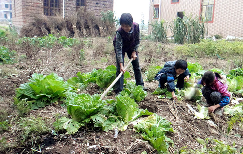 图为学生郑思思姐弟俩正在帮助外婆干农活