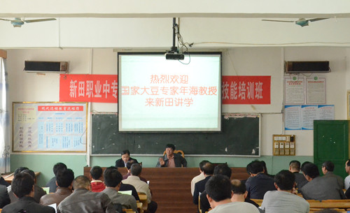 在县职业中专多媒体教室内,年海教授为我县大豆种植区的村主干及种植大户进行了优质高产大豆实用栽培技术培训,他的授课深入浅出、通俗易懂,为大家详细讲解了由县大豆协会引进的华春6号大豆的产量表现、特征、栽培要点,分析了大豆产业开发前景,并与培训人员现场互动,解答大家在种植过程中所遇到的各种问题与疑惑。通过此次培训,不少学员表示,学习到了最新的种植技术,更坚定了大豆产业开发的前景和信心,受益匪浅。