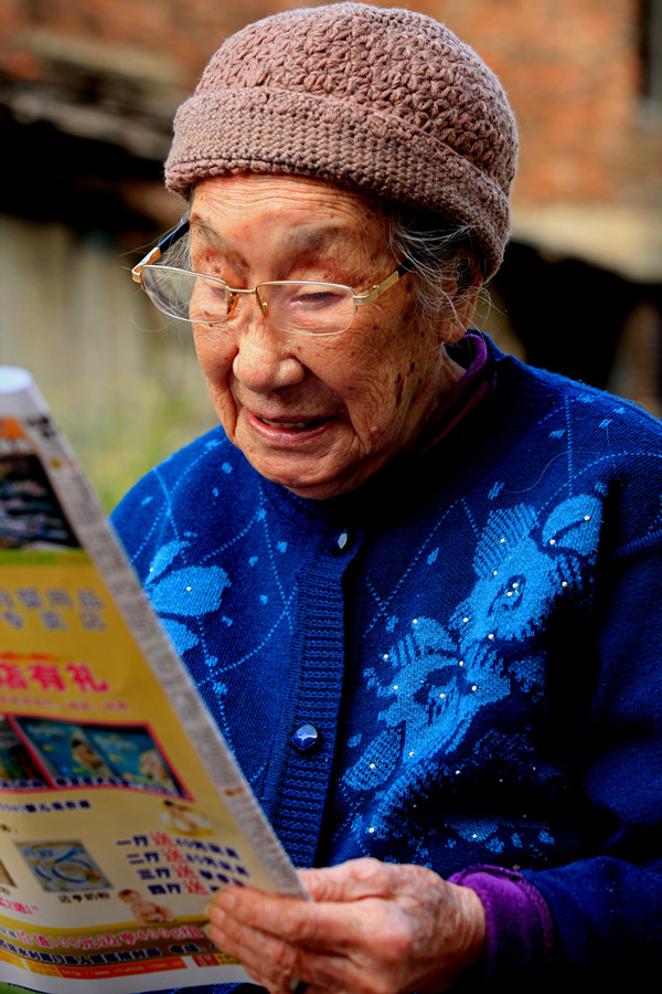 肖喜贞,98岁,龙泉镇人,身体健康,每天还坚持读报