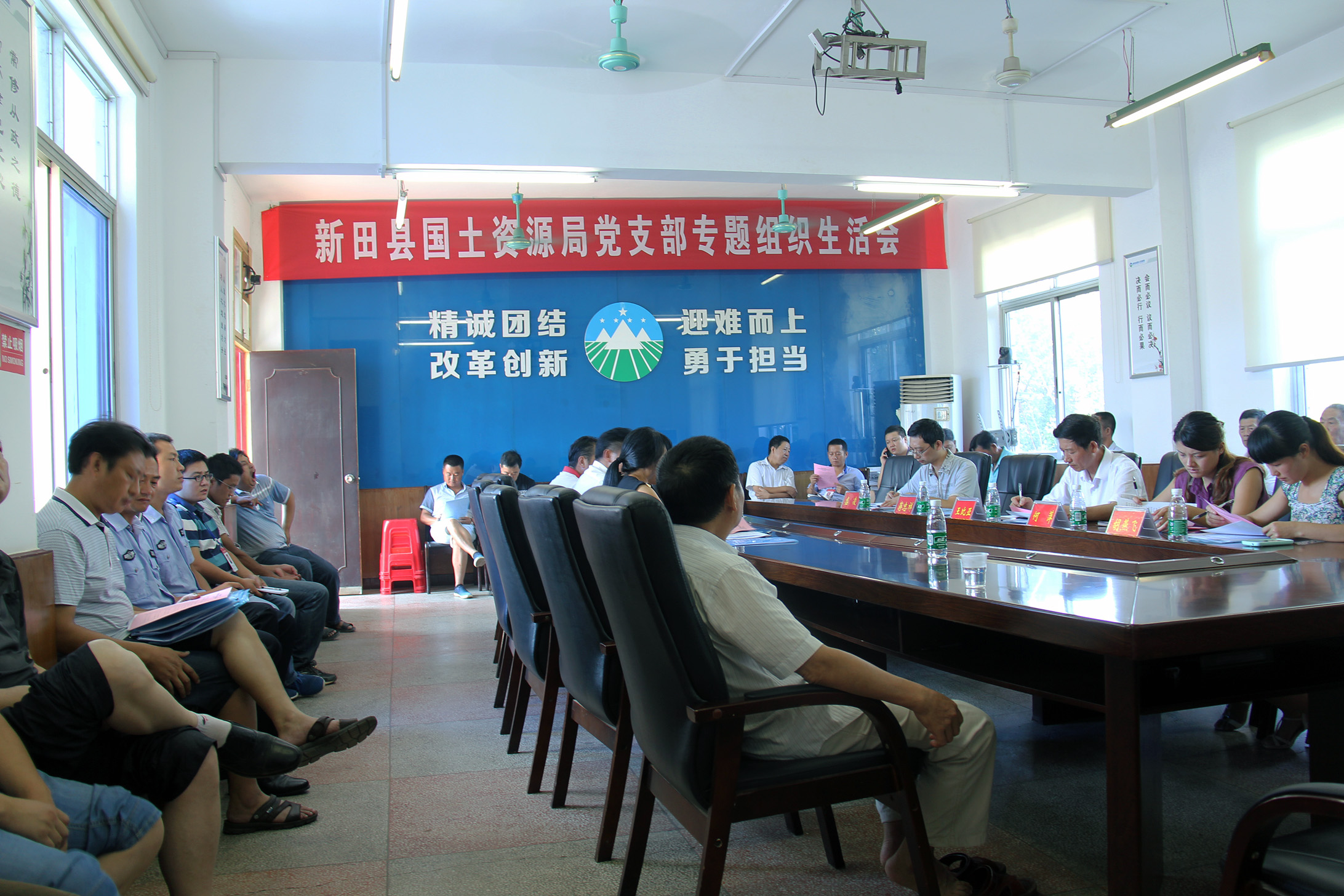 8月28日下午,新田县国土资源局机关党支部专题组织生活会在该局三楼会议室召开,会议紧紧围绕保持党的先进性和纯洁性,按照“照镜子、正衣 冠、洗洗澡、治治病”的总要求,以“反对‘四风’、服务群众”为重点,切实解决形式主义、官僚主义、享乐主义和奢靡之风问题。县直15督导组全体成员、县 委活动办领导到会指导,国土资源局机关党支部全体党员参加了会议。