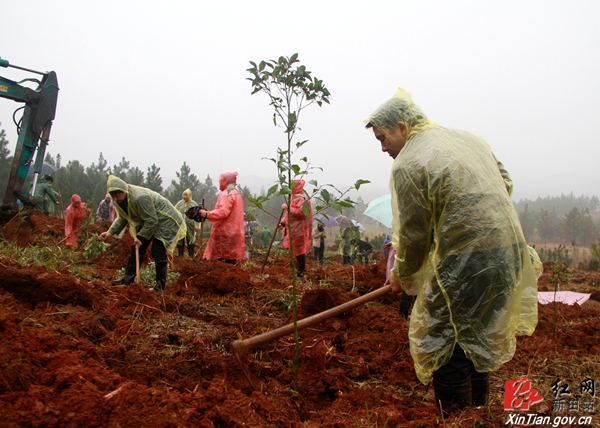 3月10上午,县财政局、地税局、烤烟办、农机局、人民银行、人保公司、统计局等后盾单位组织60余人到石羊镇欧家窝开展植树造林活动,虽然天空下着细雨,但是大家热情不减,纷纷披上雨衣,你挖土,他扶苗,干得热火朝天,为国家森林城市创建出汗出力。县政协副主席毛群联参加植树活动。