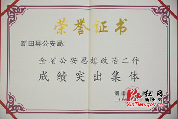 新田新闻网(通讯员 乐剑平)1月3日,新田县公安局被湖南省公安厅授予了全省公安思想政治工作成绩突出集体荣誉证书。