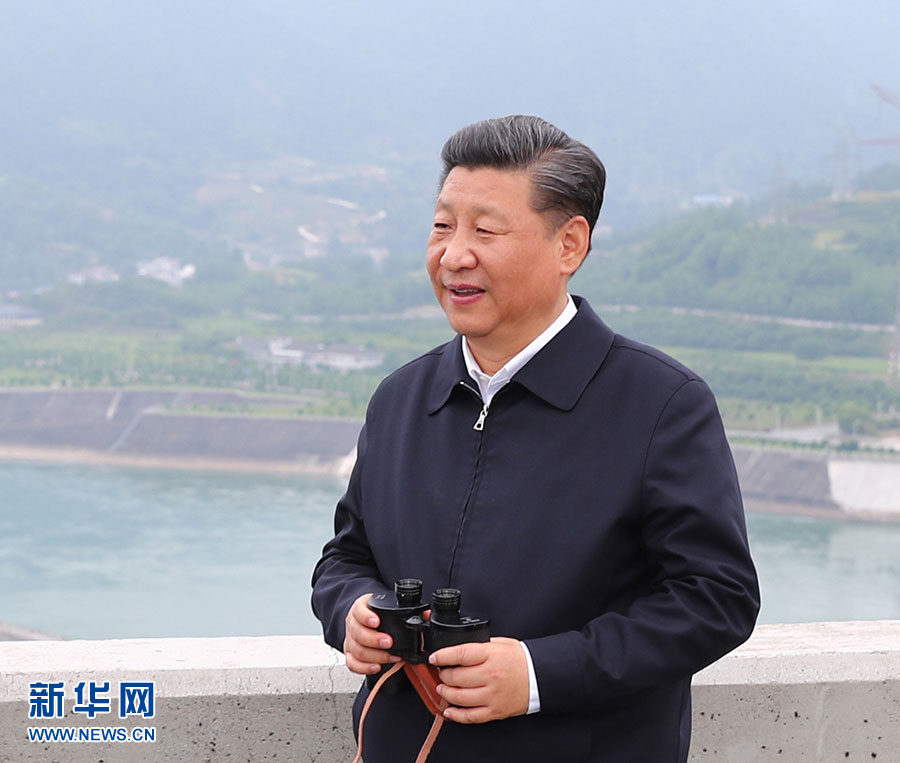 2018年4月28日,习近平在三峡大坝坝顶察看三峡工程全貌和坝区周边生态环境。图片来源:新华社