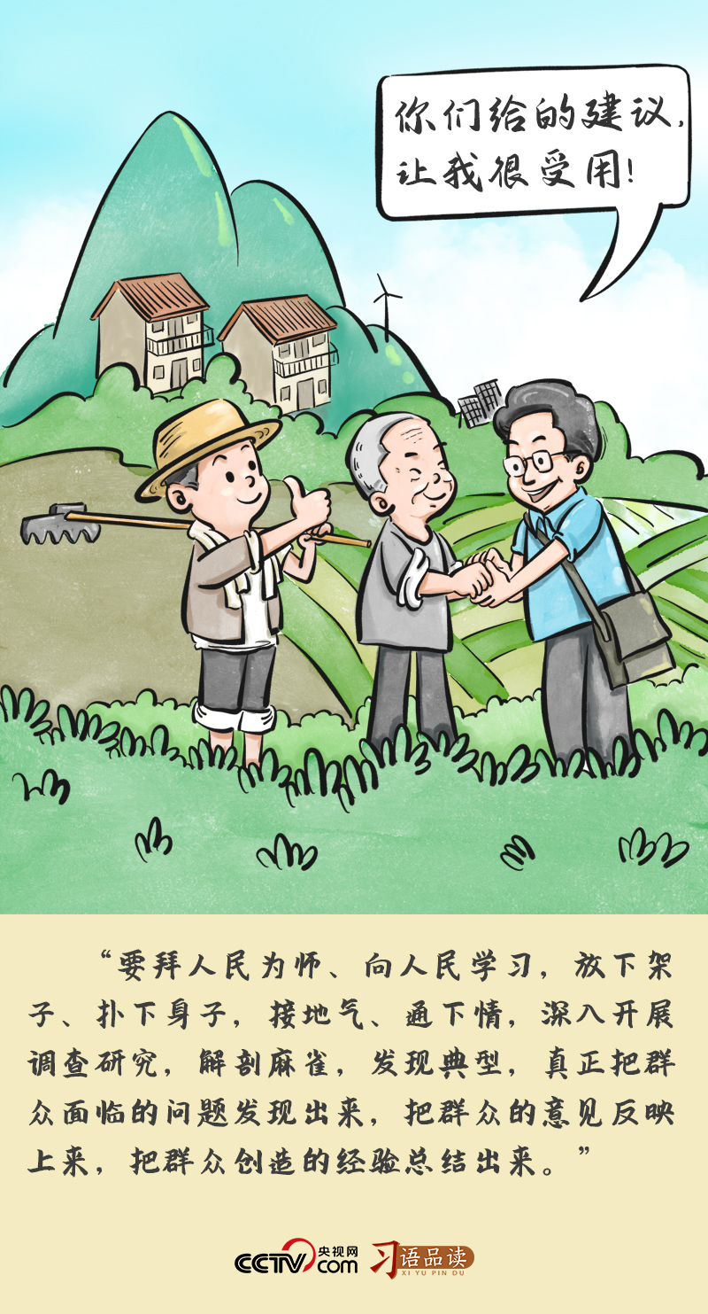 人民是最好的老师,基层是最大的课堂。“领导干部进行调查研究,要放下架子、扑下身子,深入田间地头和厂矿车间,同群众一起讨论问题,倾听他们的呼声,体察他们的情绪,感受他们的疾苦,总结他们的经验,吸取他们的智慧。”拜人民为师,习近平以言传身教的方式作出表率。