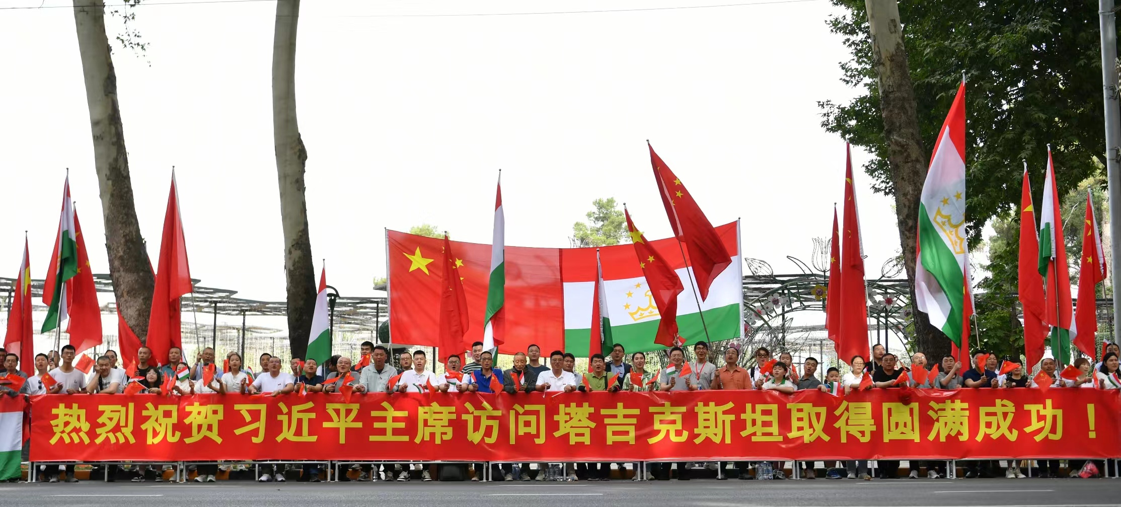 赴机场途中,当地华侨华人和中资机构代表在道路两旁挥舞中塔两国国旗,祝贺习近平主席对塔吉克斯坦国事访问取得圆满成功。